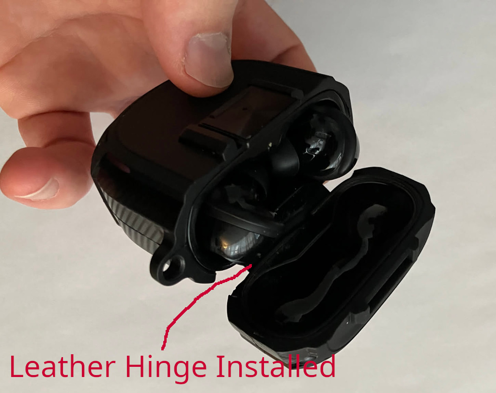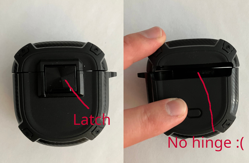 My wife suggested I look at protective cases. I needed something that would latch shut, so I landed with the Olytop for New Bose QuietComfort Earbuds II (2022) / Ultra (2023) Case Cover with Lock Clip for $20 CAD. Unfortunately, I didn’t pay close attention to the photos of the back of this case, and there was no hinge!