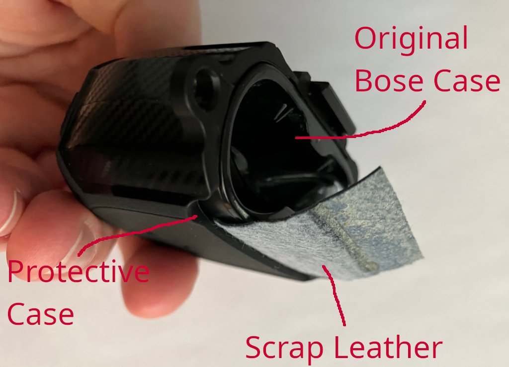 I decided to keep the case, and make my own hinge. I took a scrap piece of leather (I cut up an old wallet), and placed it, friction-fit, between the Bose case and the protective case.
