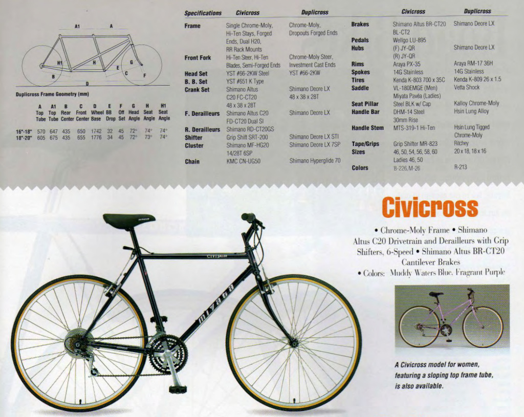 In 2004, I was living in Toronto near Bathurst and Eglinton, and commuting by TTC to my job at a company that built control systems for pipe organs near Woodbine & John, in Markham - about 20 km. As spring approached, I thought it might be fun to try commuting by bike. I wasn’t 100% committed to the idea, so I was looking for something affordable - I found a used Miyata Civicross for which I paid $175. The Civicross is a hybrid entry level bike, made in Taiwan, sold in early 1990s.