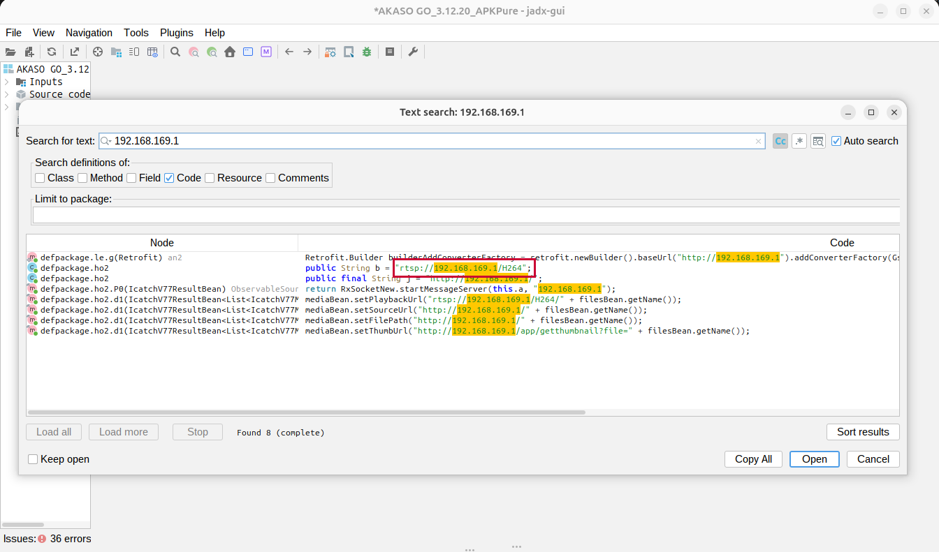 I received an email from someone who’s Akaso EK7000 worked differently from mine - none of the links I found above worked with THEIR EK7000. My camera, and the findings above, are based on firmware version DLC7789IPS135V3. Their camera reported firmware version SN-53-250802-V1. They were wanting to get streaming video from their camera. They shared that, when connected to their camera’s wifi, the camera’s IP was 192.168.169.1 (different from mine), and port 554 wasn’t open. I didn’t have access to their camera, so I opened the Akaso Go app in the jadx decompiler, and searched for 192.168.169.1.